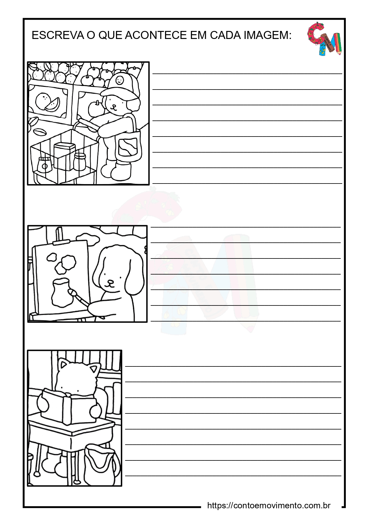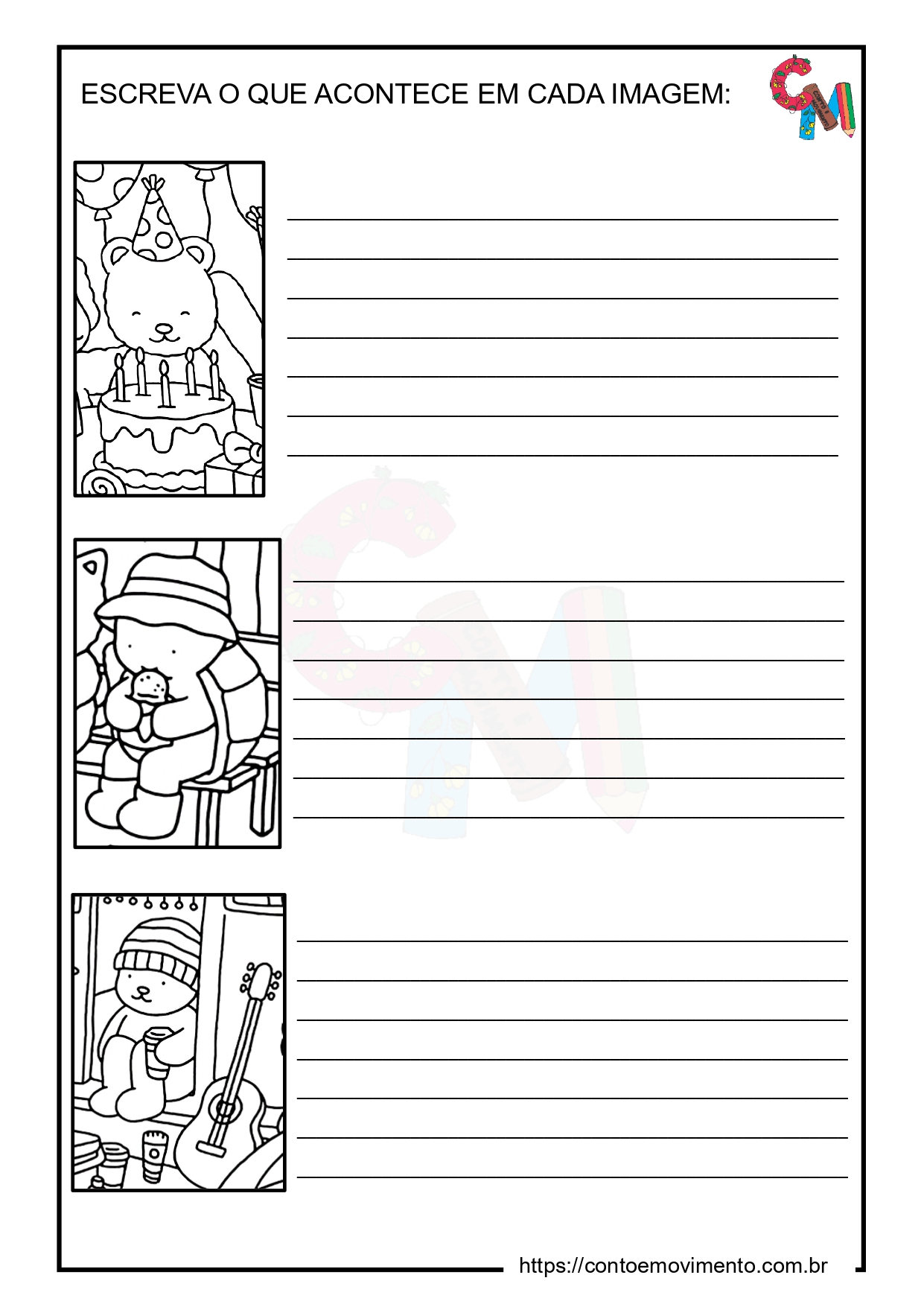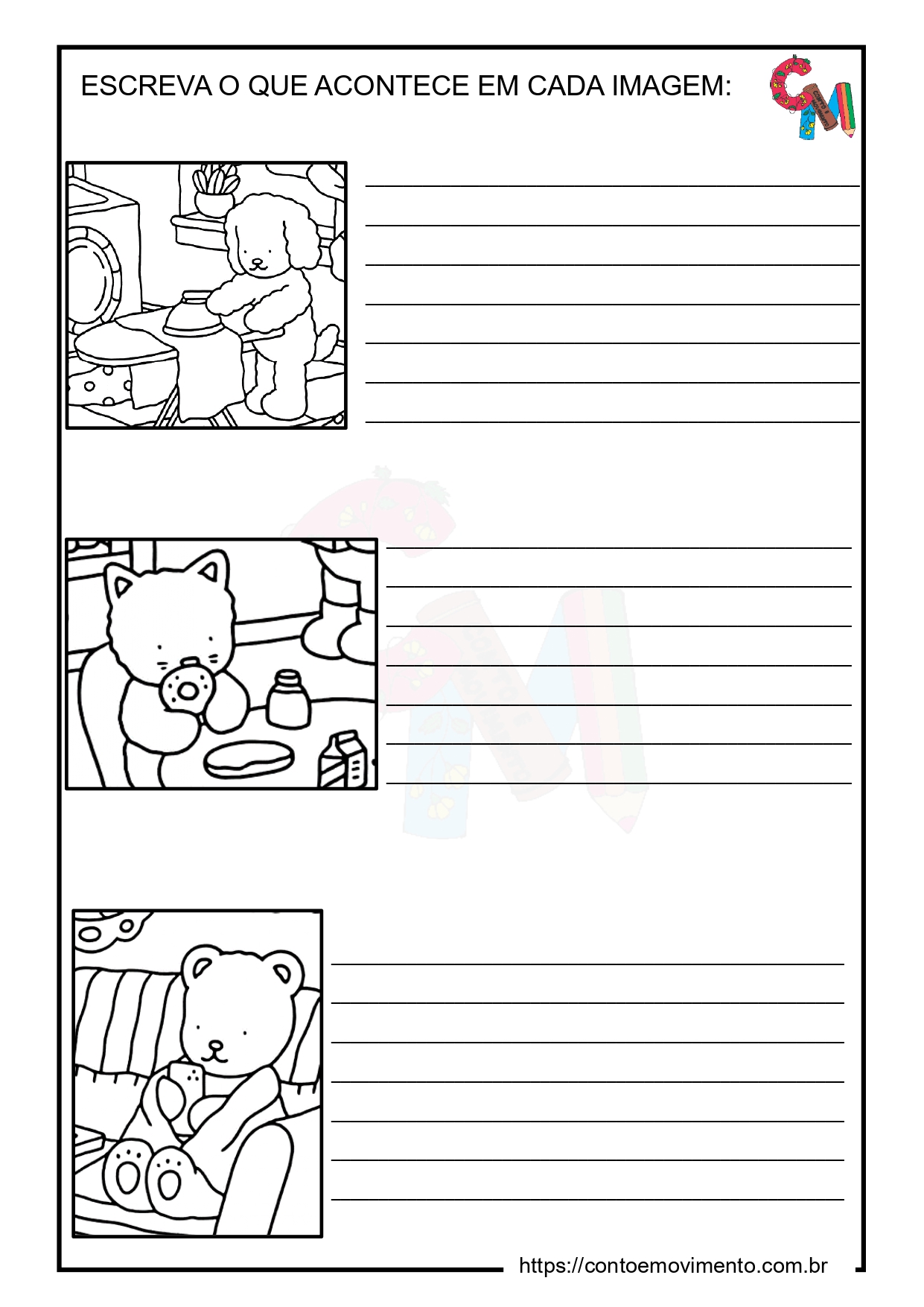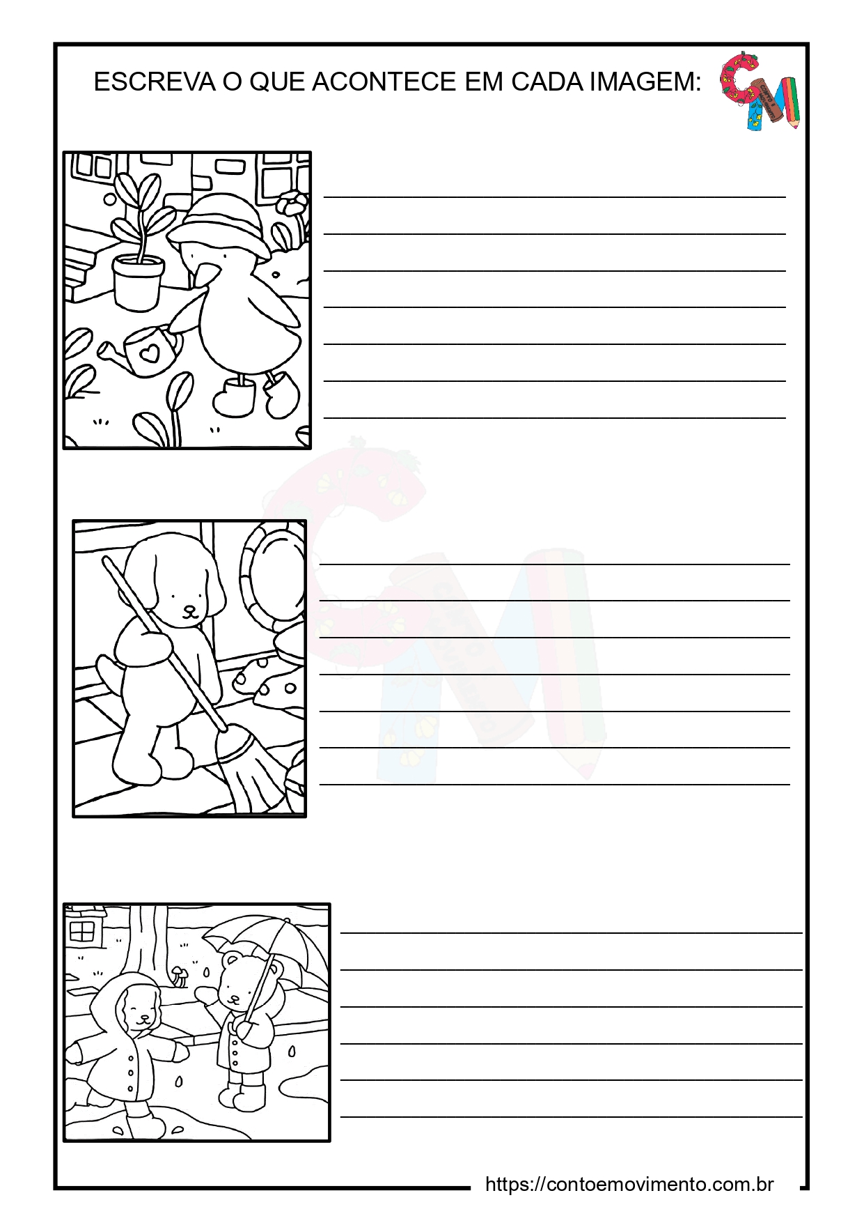 Com esse material , os alunos observam as imagens e escrevem o que está acontecendo em cada cena, estimulando a imaginação, o vocabulário e a construção de frases completas.