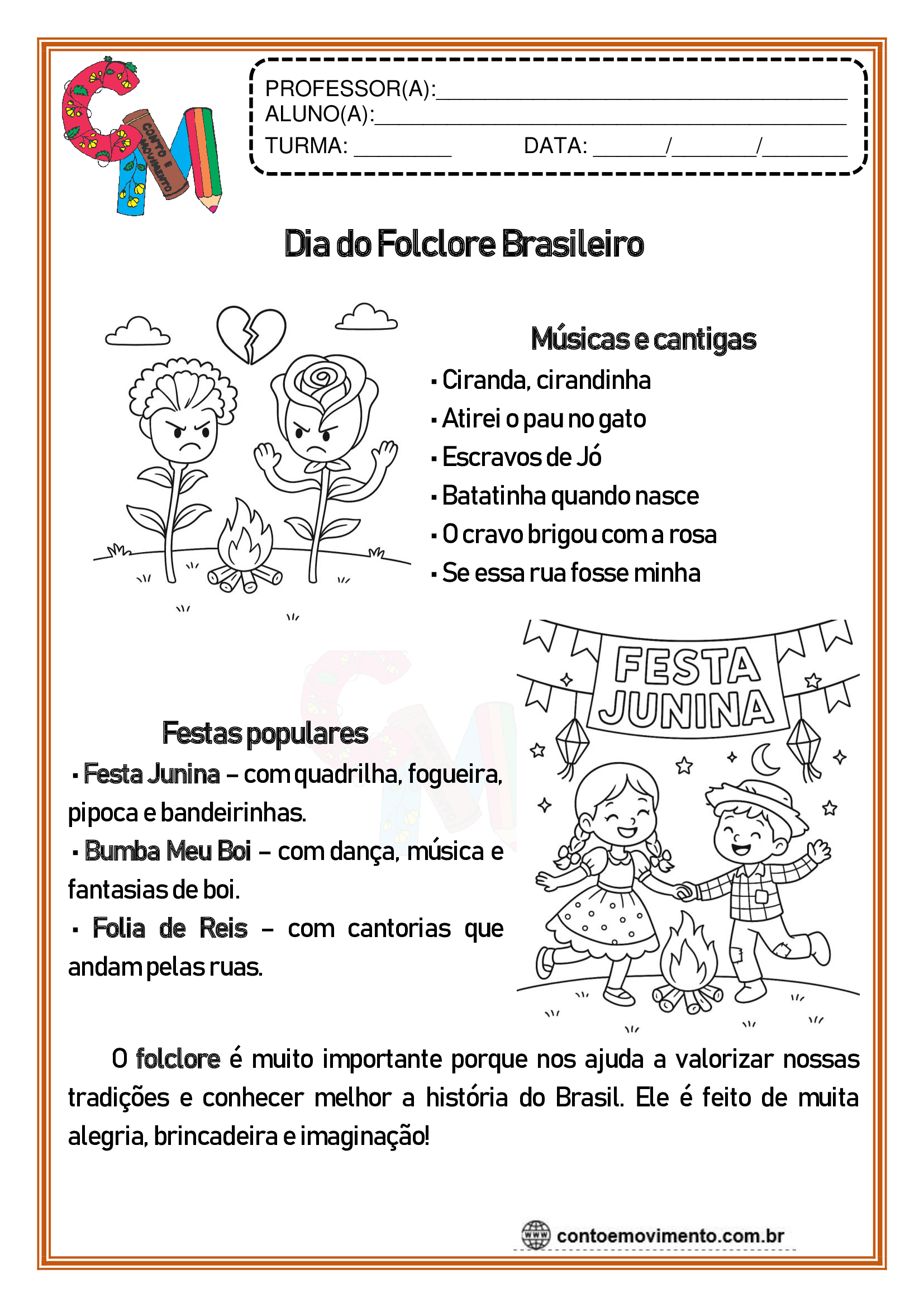 🎨 Dica: trabalhar com lápis de colorir, guache ou colagem para explorar texturas.Dia do Folclore brasileiro: Lendas Folclore