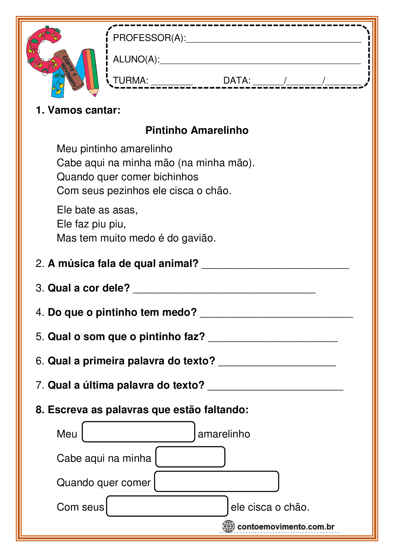 Trabalharão com identificação de palavras, compreensão textual e completarão versos com palavras da canção.