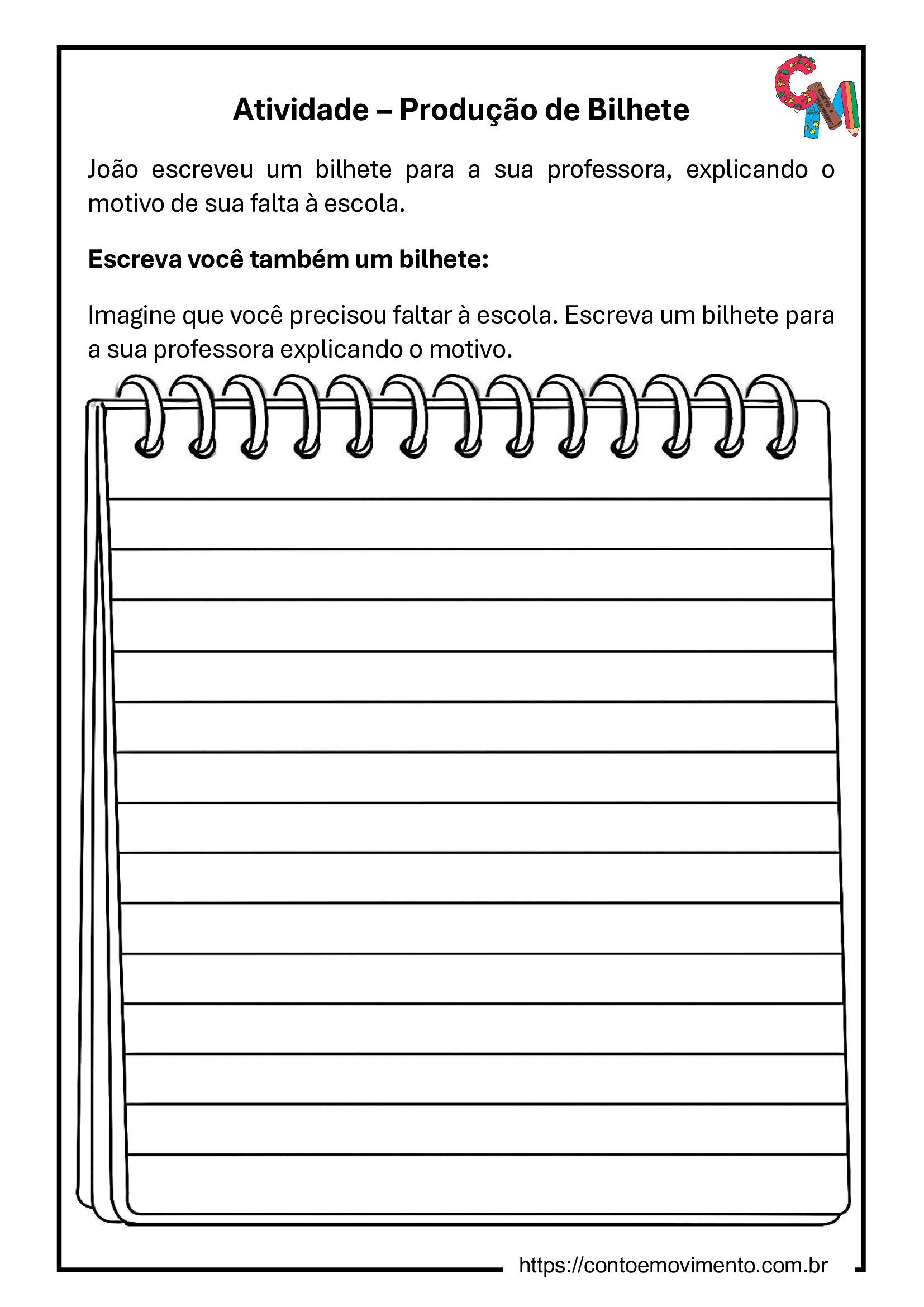Em seguida, os alunos são convidados a produzir o próprio bilhete, imaginando que também precisaram faltar à escola.