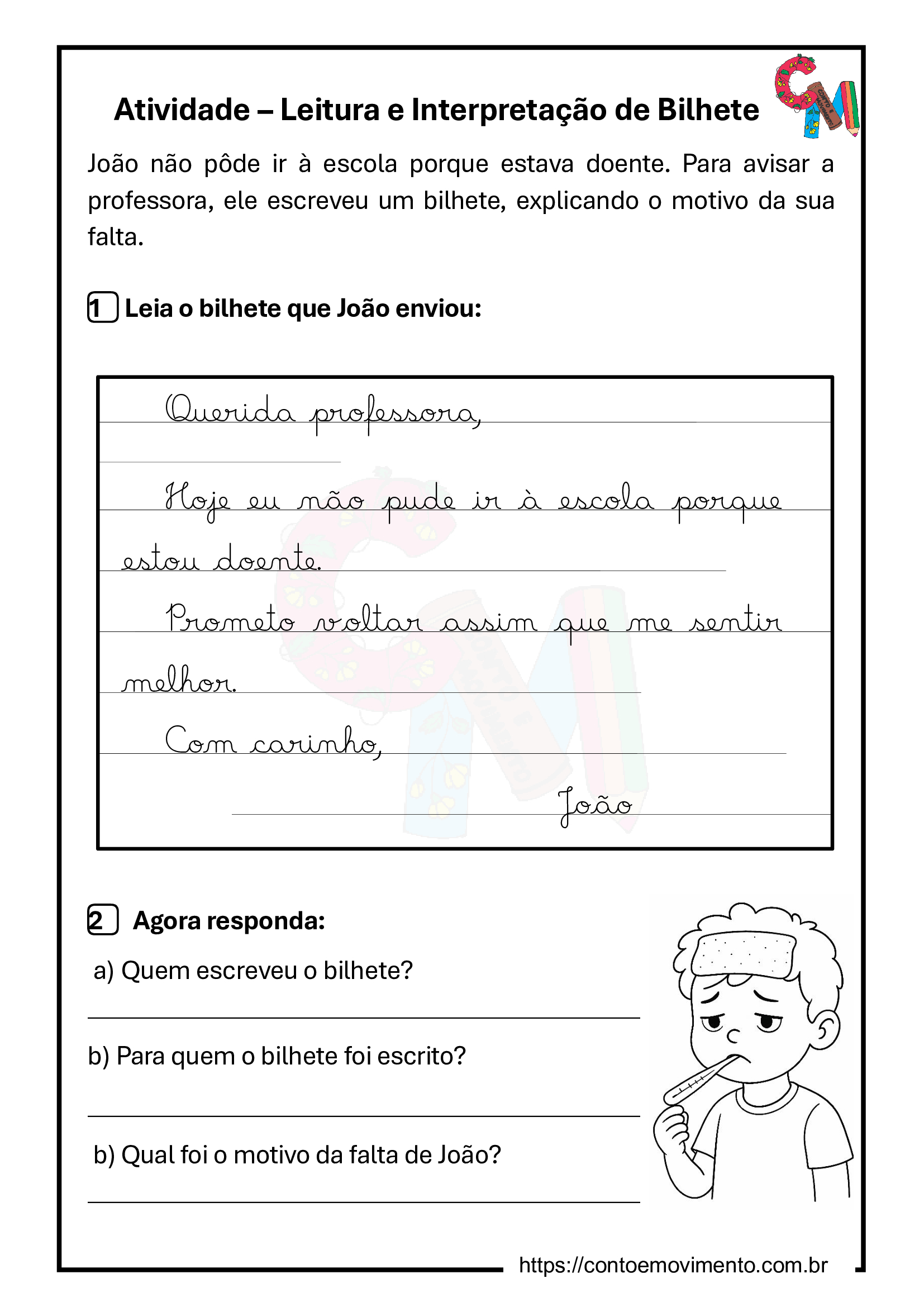 O aluno começa lendo um bilhete escrito pelo João explicando sua ausência na escola.
