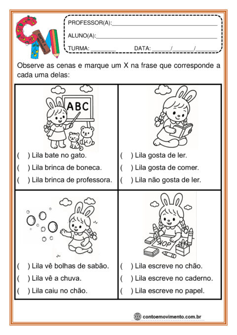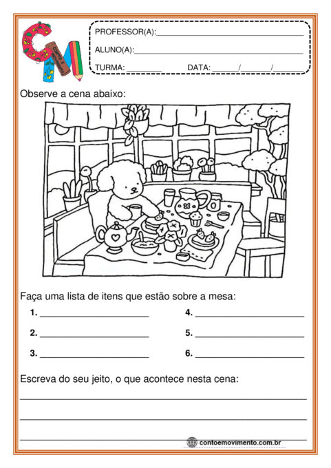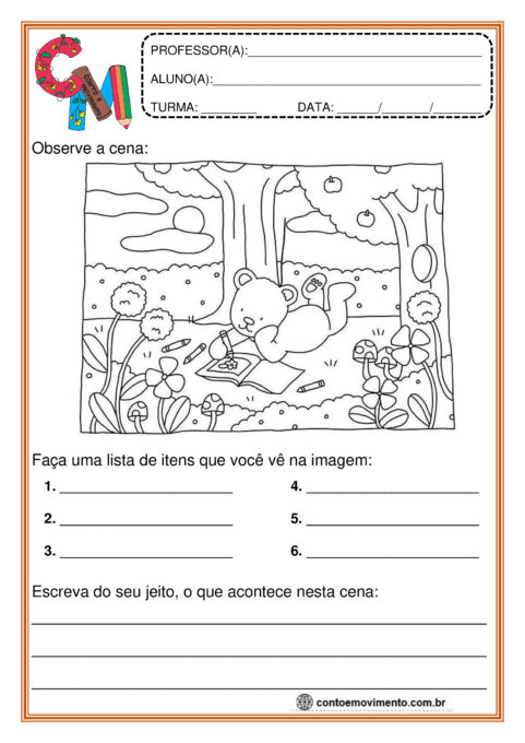 Utilizando a última linha da atividade, os alunos escrevem uma frase sobre o que acontece na cena, iniciando a atividade de produção de texto de forma simples e significativa.