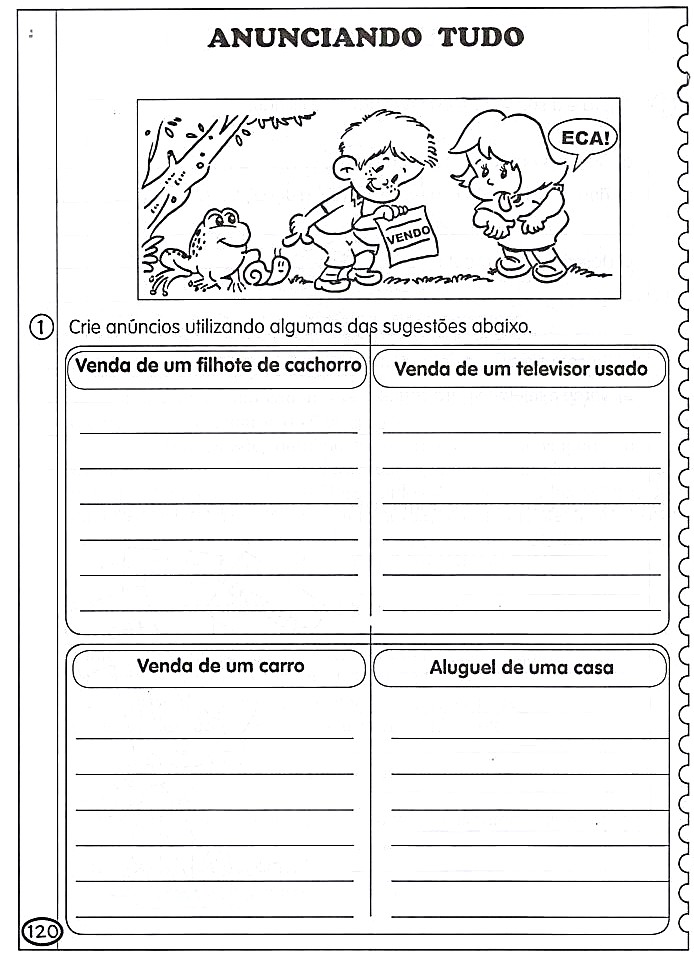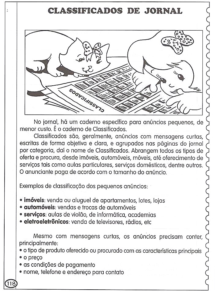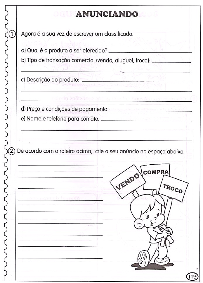 Por fim, a atividade sobre classificados ensina os alunos a produzir textos curtos, objetivos e com finalidade prática, como anúncios de compra, venda ou oferta de serviços. Dessa forma, eles aprendem a usar linguagem concisa e informativa, reconhecendo o propósito comunicativo desse gênero.