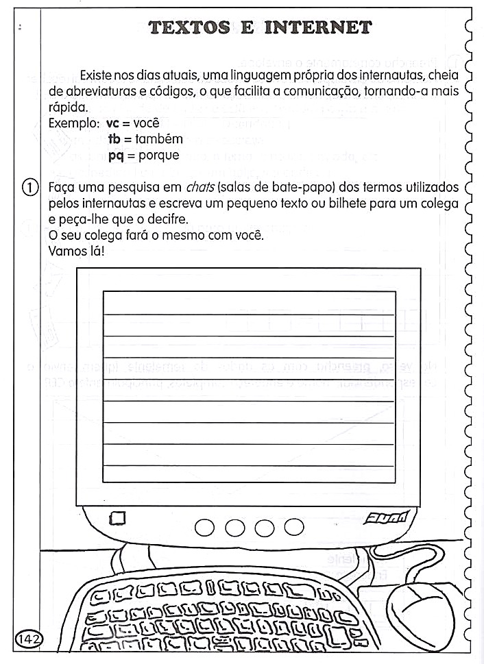 A proposta “Textos e Internet” leva o aluno a refletir sobre as novas formas de comunicação online, como mensagens curtas e abreviações usadas em chats e redes sociais.