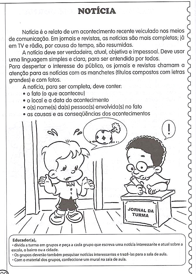 As atividades sobre notícia ajudam a desenvolver a escrita informativa, destacando os elementos essenciais de uma notícia: o que aconteceu, onde, quando, quem esteve envolvido e por quê.