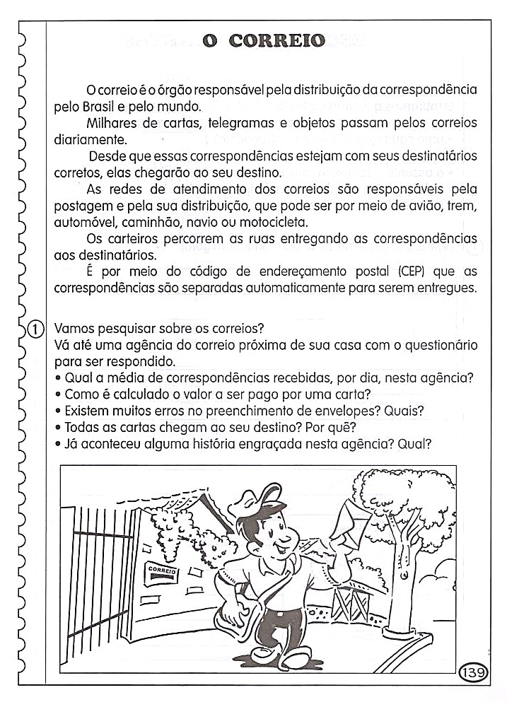 As atividades sobre cartas e envelopes permitem que o aluno compreenda a estrutura de uma correspondência: saudação, corpo do texto, despedida e assinatura.