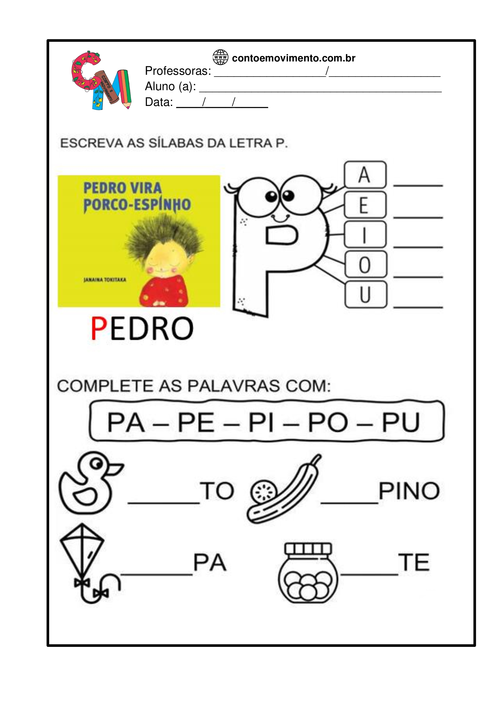 Trabalhar a letra P, sílabas (PA – PE – PI – PO – PU) e completar palavras ilustradas (imagem 2).